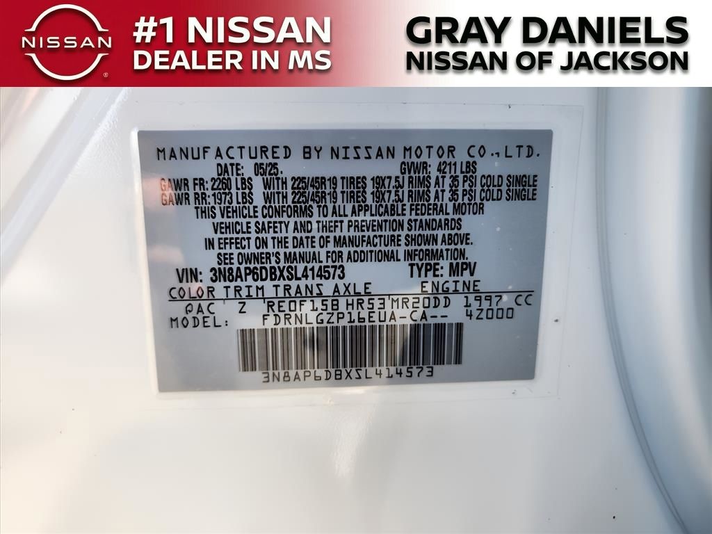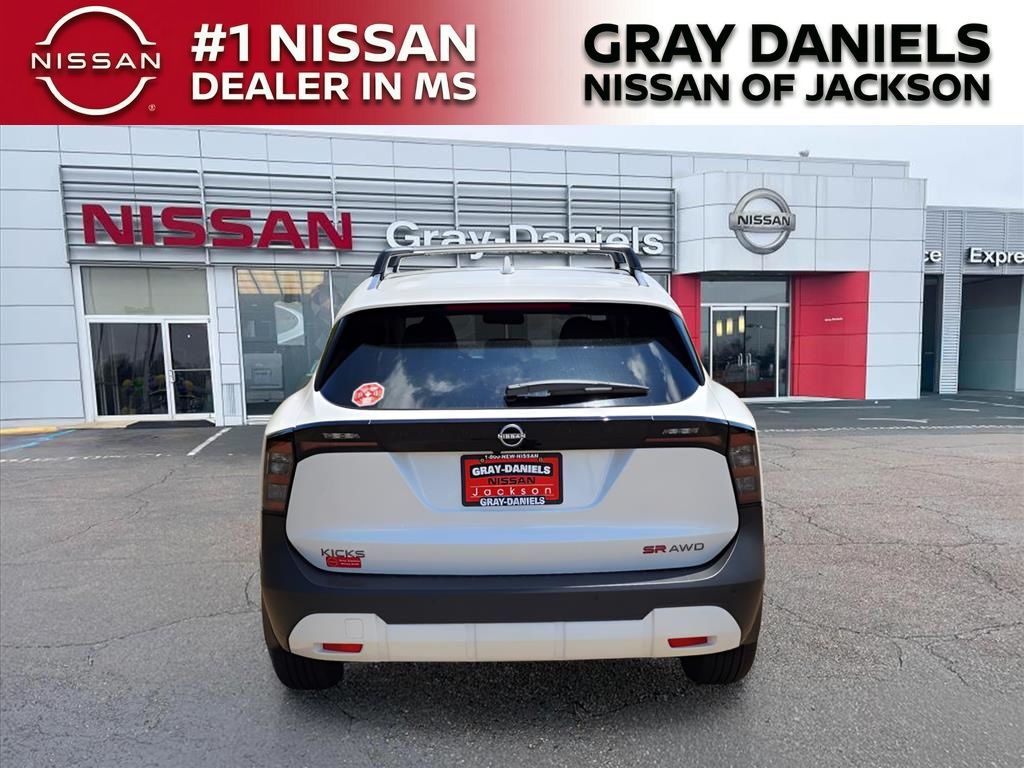 2025 Nissan Kicks Aspen White Tricoat 4D Sport Utility SRAWD CVT with Xtronic 2.0L DOHCSR Package, 19 Alloy Wheels, 4-Wheel Disc Brakes, 6 Speakers, ABS brakes, Air Conditioning, Alloy wheels, AM/FM radio: Sirius, Auto High-beam Headlights, Automatic temperature control, Brake assist, Bumpers: body-color, Carpeted Floor Mats, Crossbars, Delay-off headlights, Driver door bin, Driver vanity mirror, Dual front impact airbags, Dual front side impact airbags, Electronic Stability Control, Four wheel independent suspension, Front anti-roll bar, Front Bucket Seats, Front Center Armrest, Front reading lights, Fully automatic headlights, Heated door mirrors, Illuminated entry, Knee airbag, Leather Shift Knob, Leather steering wheel, Low tire pressure warning, Occupant sensing airbag, Outside temperature display, Overhead airbag, Overhead console, Panic alarm, Passenger door bin, Passenger vanity mirror, Power door mirrors, Power steering, Power windows, Premium Paint, Radio data system, Radio: AM/FM Audio System, Rear anti-roll bar, Rear reading lights, Rear seat center armrest, Rear side impact airbag, Rear window defroster, Rear window wiper, Remote keyless entry, Security system, Speed control, Speed-sensing steering, Splash Guards, Split folding rear seat, Spoiler, Sport steering wheel, Steering wheel mounted audio controls, Tachometer, Telescoping steering wheel, Tilt steering wheel, Traction control, Trip computer, Turn signal indicator mirrors, Variably intermittent wipers, Wireless Apple CarPlay/Wireless Android Auto. 27/34 City/Highway MPGWith Gray Daniels Nissan North of Jackson, you'll benefit from one of the largest inventories in the state. All of our vehicles are competitively priced with Legendary Low Prices Gray Daniels Nissan North is proud to serve the entire State of Mississippi including: Jackson, Ridgeland, Brandon, Madison, Yazoo City, Richland, Pearl, Flowood, Vicksburg, Meridian, Carthage, Magee, Mendenhall, Collins, Senatobia, Greenwood, Greenville, Flora, Hattiesburg and Gulfport. CALL TODAY 601-899-7400!!!
