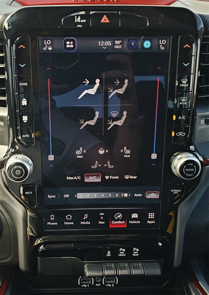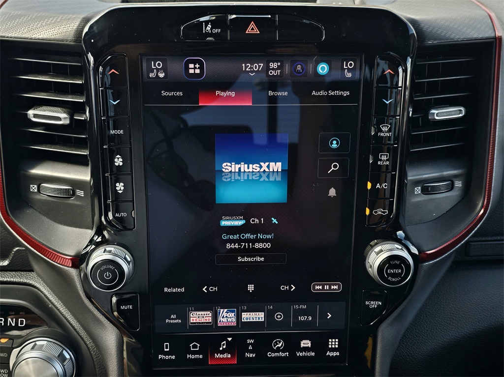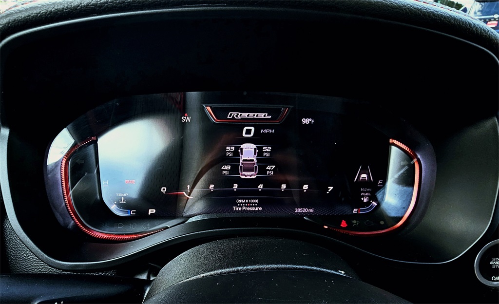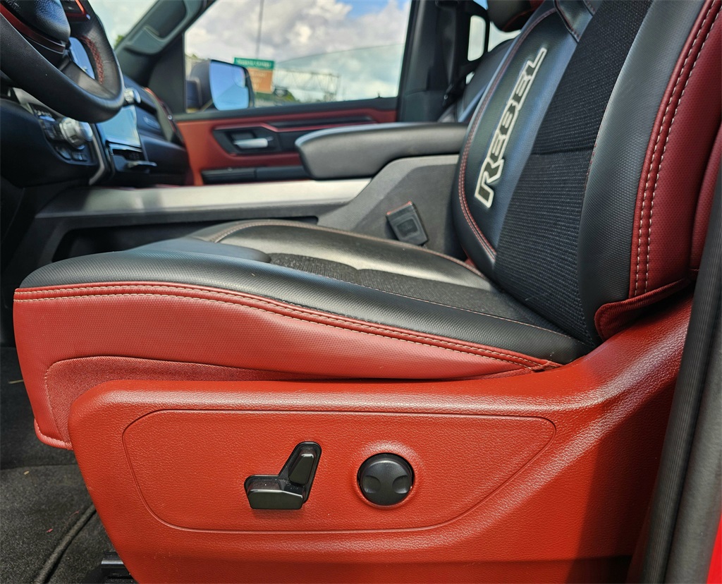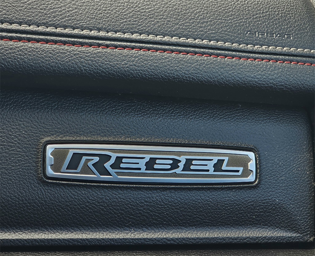 One Owner Trade, 10 Speakers, 3.92 Rear Axle Ratio, 4 Way Front Headrests, 4-Wheel Disc Brakes, 4G LTE Wi-Fi Hot Spot, ABS brakes, Air Conditioning, Alloy wheels, AM/FM radio: SiriusXM with 360L, Apple CarPlay, Apple CarPlay/Android Auto, Auto High-beam Headlights, Auto Power-Folding Mirrors, Auto-Dimming Exterior Driver Mirror, Auto-dimming Rear-View mirror, Automatic temperature control, Black Premium Power Mirrors, Brake assist, Bucket Seats, Cloth/Vinyl Bucket Seats, Compass, Connected Travel & Traffic Services, Connectivity - US/Canada, Convex Wide-Angle Exterior Mirror Insert, Delay-off headlights, Driver door bin, Driver vanity mirror, Dual front impact airbags, Dual front side impact airbags, Electronic Stability Control, Exterior Mirrors Courtesy Lamps, Exterior Mirrors w/Heating Element, Exterior Mirrors w/Supplemental Signals, Front anti-roll bar, Front Bucket Seats, Front Center Armrest w/Storage, Front dual zone A/C, Front fog lights, Front License Plate Bracket, Front reading lights, Front Seat Back Map Pockets, Front wheel independent suspension, Full Length Upgraded Floor Console, Fully automatic headlights, Garage door transmitter, Google Android Auto, GPS Antenna Input, GPS Navigation, Heated door mirrors, Heated front seats, Heated steering wheel, Illuminated entry, Integrated Voice Command w/Bluetooth, Leather steering wheel, Low tire pressure warning, Manual Folding Exterior Mirrors, Manufacturer's Statement of Origin, Navigation System, Occupant sensing airbag, Outside temperature display, Overhead airbag, Overhead console, Panic alarm, ParkView Rear Back-Up Camera, Passenger door bin, Passenger vanity mirror, Power Adjust 8-Way Driver Seat, Power Adjustable Pedals, Power door mirrors, Power driver seat, Power steering, Power windows, Quick Order Package 21W Rebel, Radio data system, Radio: Uconnect 5 Nav w/12.0" Display, Rear 60/40 Folding Seat, Rear anti-roll bar, Rear seat center armrest, Rear step bumper, Rear Window Defroster, Rebel Level 1 Equipment Group, Remote keyless entry, Remote Tailgate Release, SiriusXM w/360L, Speed control, Split folding rear seat, Steering wheel mounted audio controls, Tachometer, Telescoping steering wheel, Tilt steering wheel, Traction control, Trip computer, USB Host Flip, Variably intermittent wipers, Voltmeter, Wheels: 18" x 8.0" Painted Mid-Gloss Black, Wireless Charging Pad.